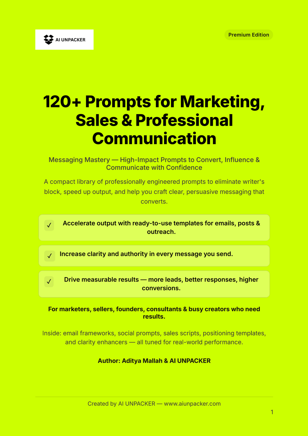 Instantly download your complete AI marketing playbook: a curated collection of over 120 professionally engineered prompts. You'll get a comprehensive library of copy-and-paste templates covering everything from high-converting email sequences and viral social media hooks to persuasive landing page copy and strategic sales scripts. This isn't just a list; it's a strategic framework designed to eliminate writer's block, bypass generic AI results, and empower you to create high-impact marketing content in minutes, not hours.