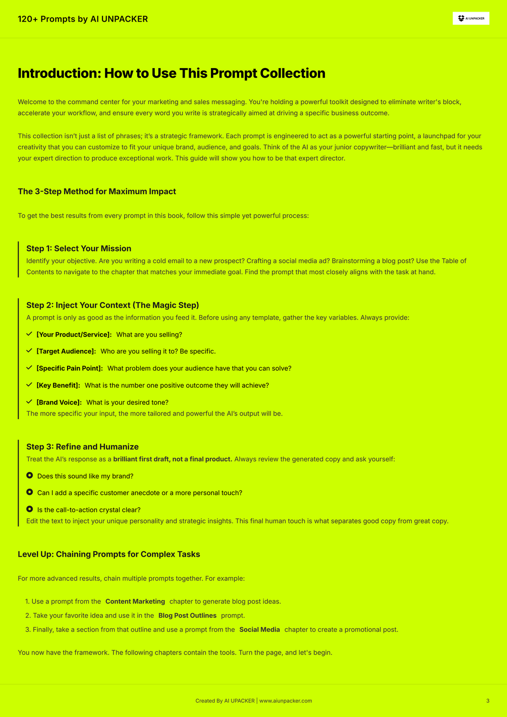 This isn't a random collection of "cool AI tricks." Every single one of the 120+ prompts is built on proven marketing principles and designed to achieve a specific business goal.
