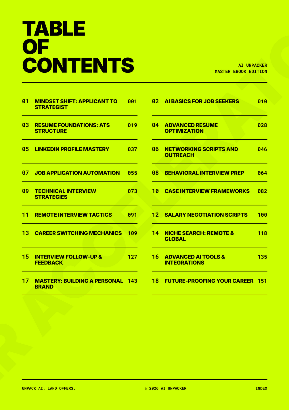 ✅ The Frustrated Job Seeker: You’re tired of "spraying and praying" applications and want a high-conversion system. ✅ The Career Switcher: You need to translate your past experience into new industry keywords without lying. ✅ The Tech Professional: You need specific prep for coding challenges, system design, and technical screenings. ✅ The Remote Worker: You want to target global roles and ace asynchronous communication interviews.