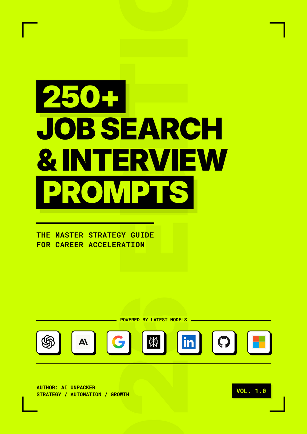 Inside, you’ll unlock a master strategy guide containing over 250 precision-engineered AI prompts designed to automate your entire job search workflow. You will gain access to proven frameworks for beating ATS filters with keyword-optimized resumes , crafting high-conversion cold outreach emails , and dominating behavioral and technical interviews with structured STAR responses. Additionally, the guide equips you with data-backed negotiation scripts to maximize your salary offers and strategies to future-proof your career against market shifts.