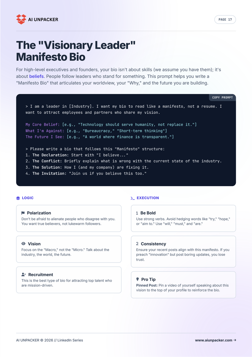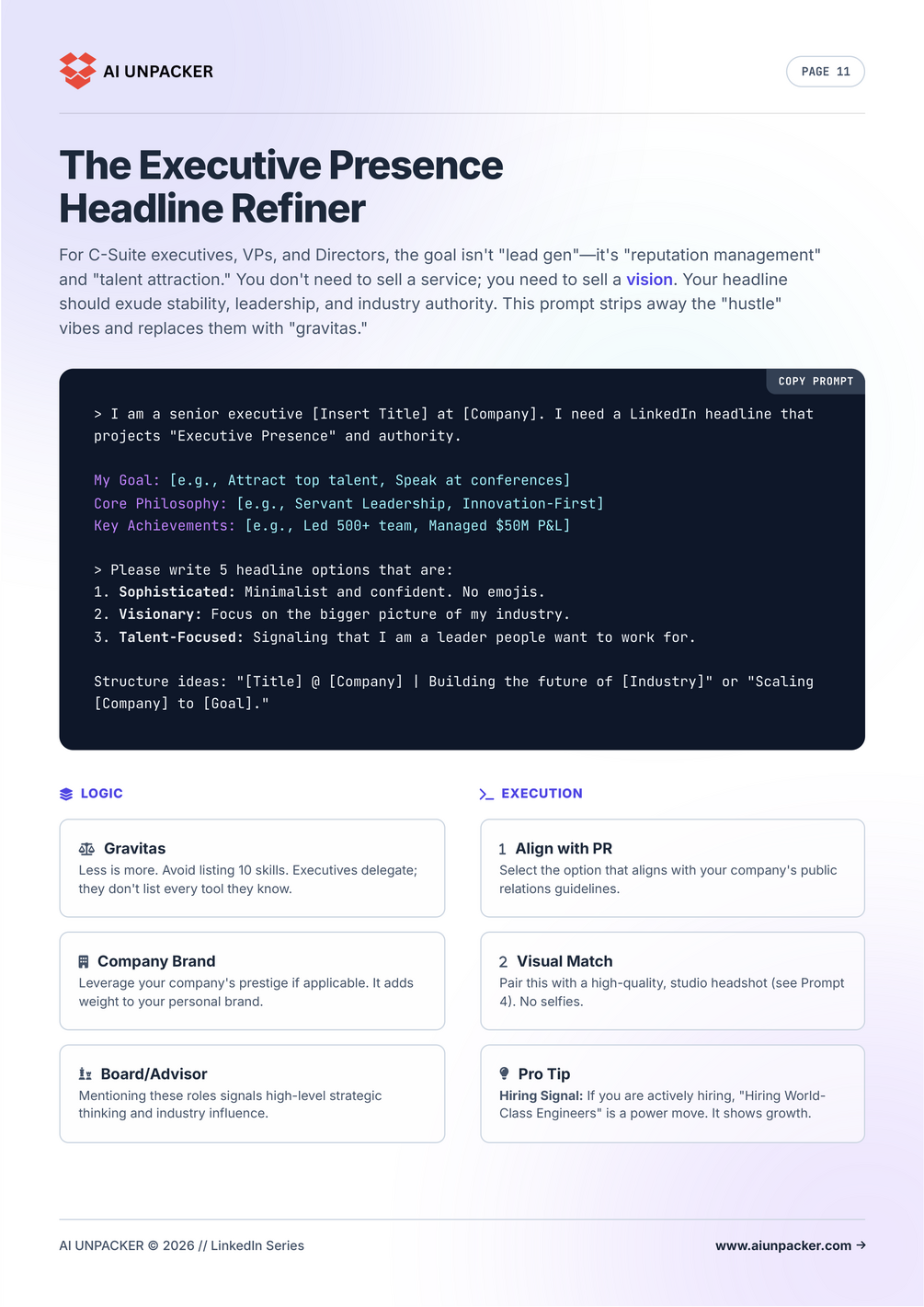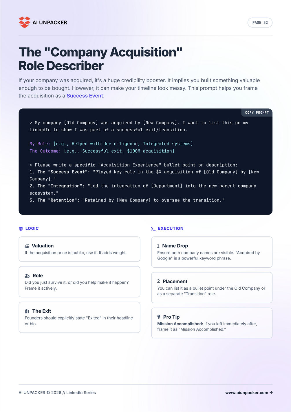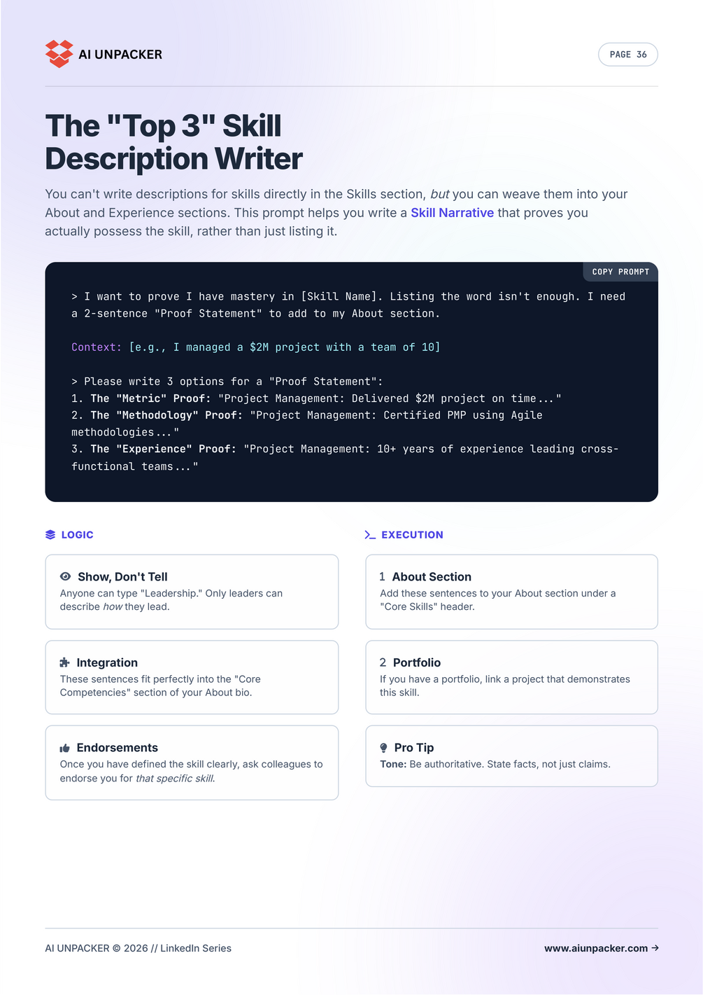 - 🎨 Ultimate Profile Makeover: Prompts to write a headline that hooks, an "About" section that sells, and experience descriptions that impress recruiters.
